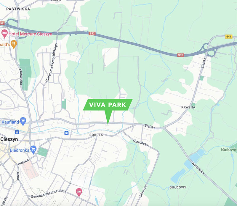 VIVA PARK Cieszyn znajduje się we wschodniej części miasta, przy ul. Stawowej 78, która przeznaczona jest przez miasto na budowę nowoczesnych powierzchni handlowych. Obiekt oferuje ponad 6 800 m² powierzchni najmu, cztery nowoczesne budynki oraz parking na 161 miejsc. Dogodna lokalizacja – tuż przy zjeździe z trasy S52 – sprawia, że obiekt jest atrakcyjnym punktem zakupowym zarówno dla mieszkańców regionu, jak i klientów z Czech.
